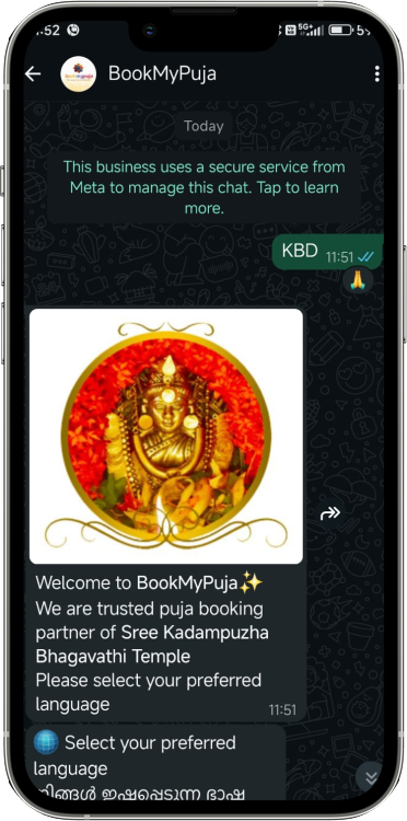 India's first WhatsApp-powered temple booking platform for Kadampuzha Temple, Malappuram. Book pujas online, receive prasadam delivery via Speed Post or Normal Post.